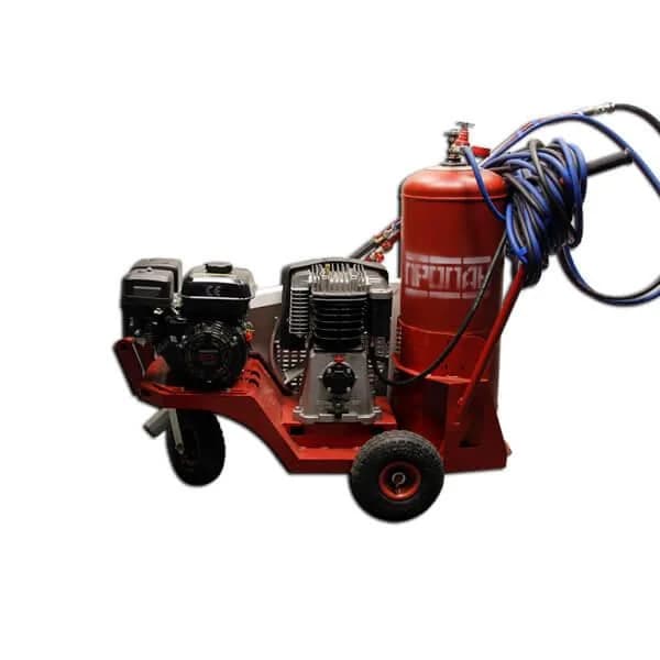 Тепловое копье для подогрева и продувки швов (с компрессорной установкой) — это автономная передвижная установка, оснащённая бензиновым двигателем, газовым баллоном с редуктором, воздушным компрессором и инжекторной газовоздушной горелкой.